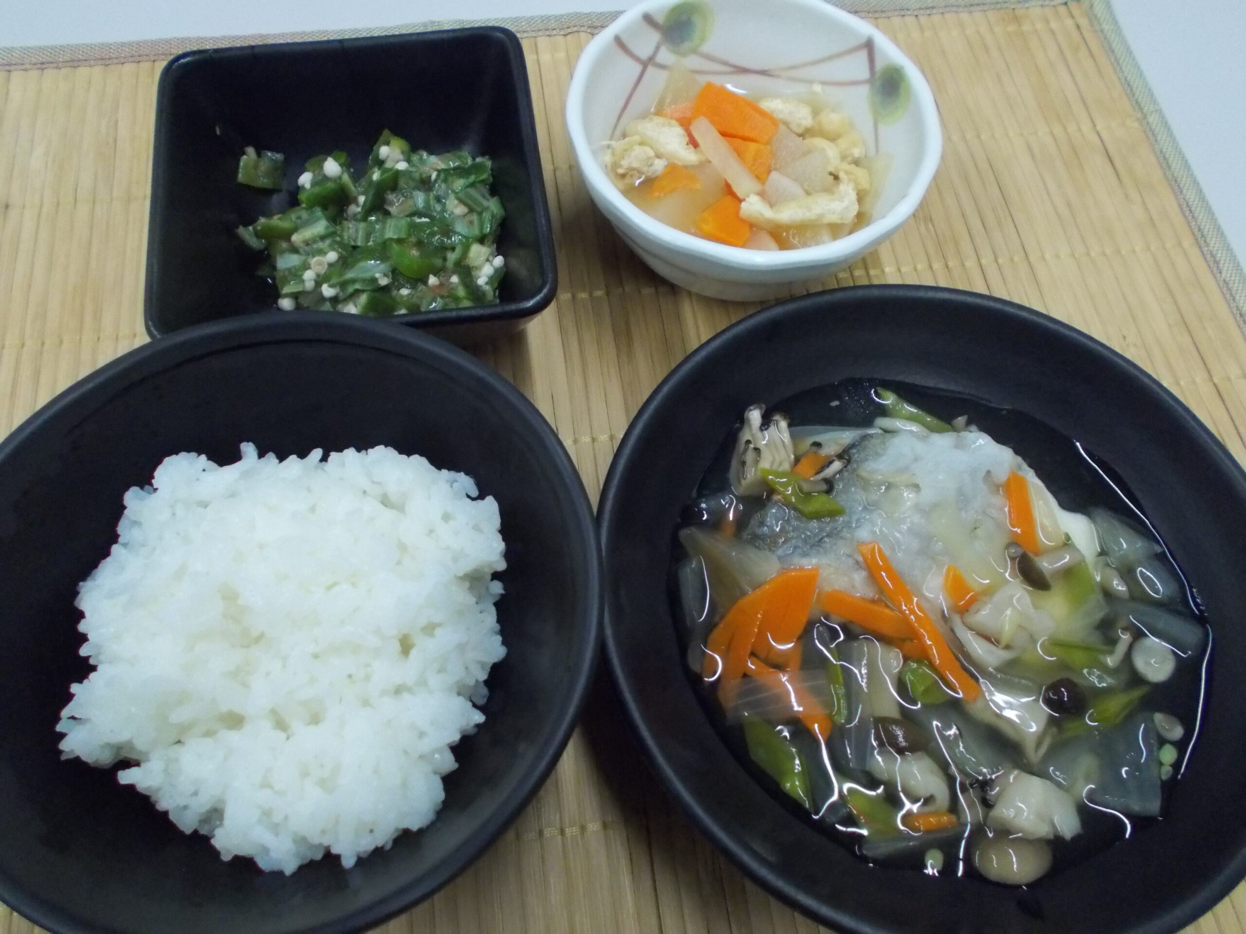 夕食 ご飯 たらの野菜あんかけ 大根の煮物 オクラのおかか和え