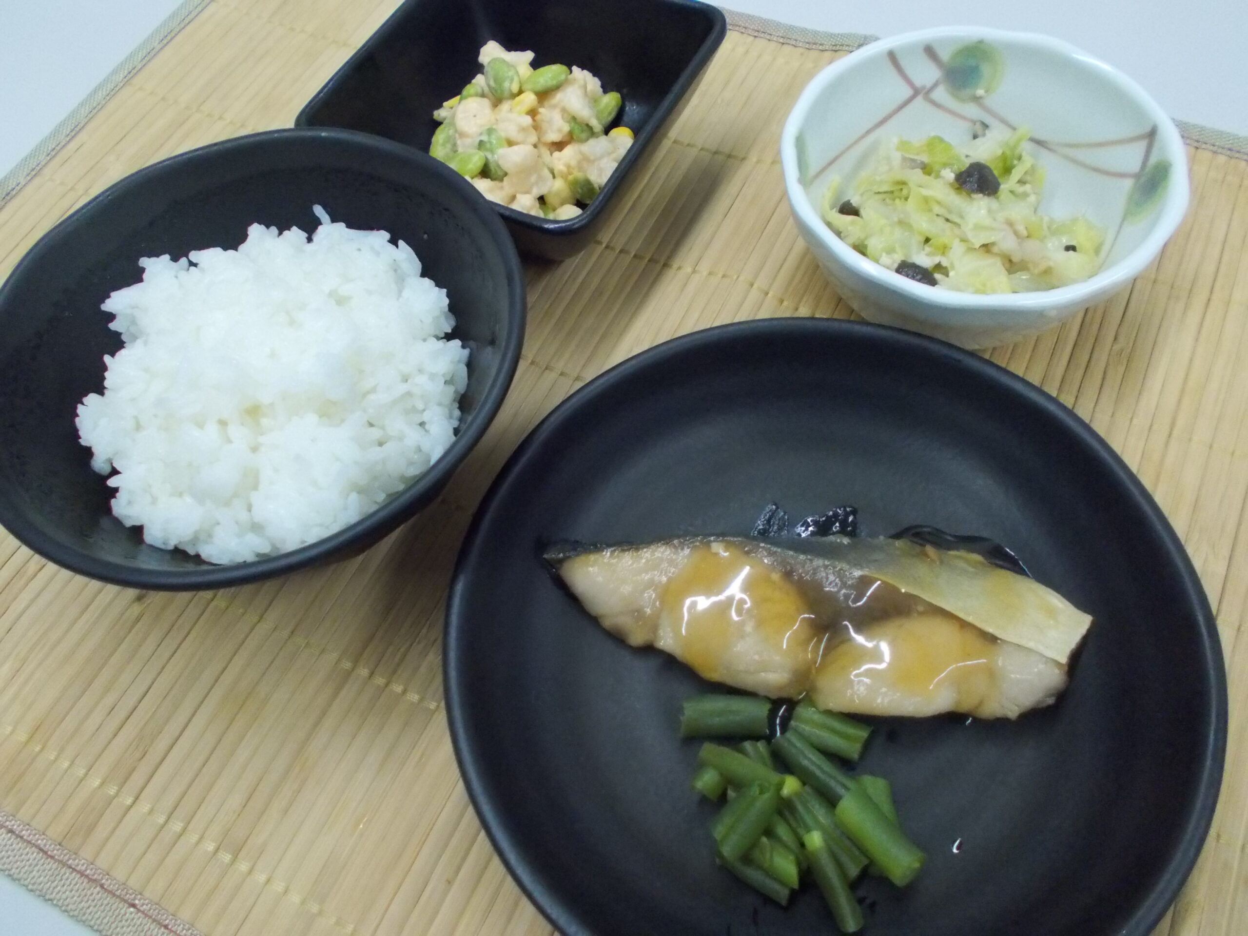 夕食 ご飯 ぶりの照り焼き キャベツのソテー 枝豆とカリフラワーのサラダ
