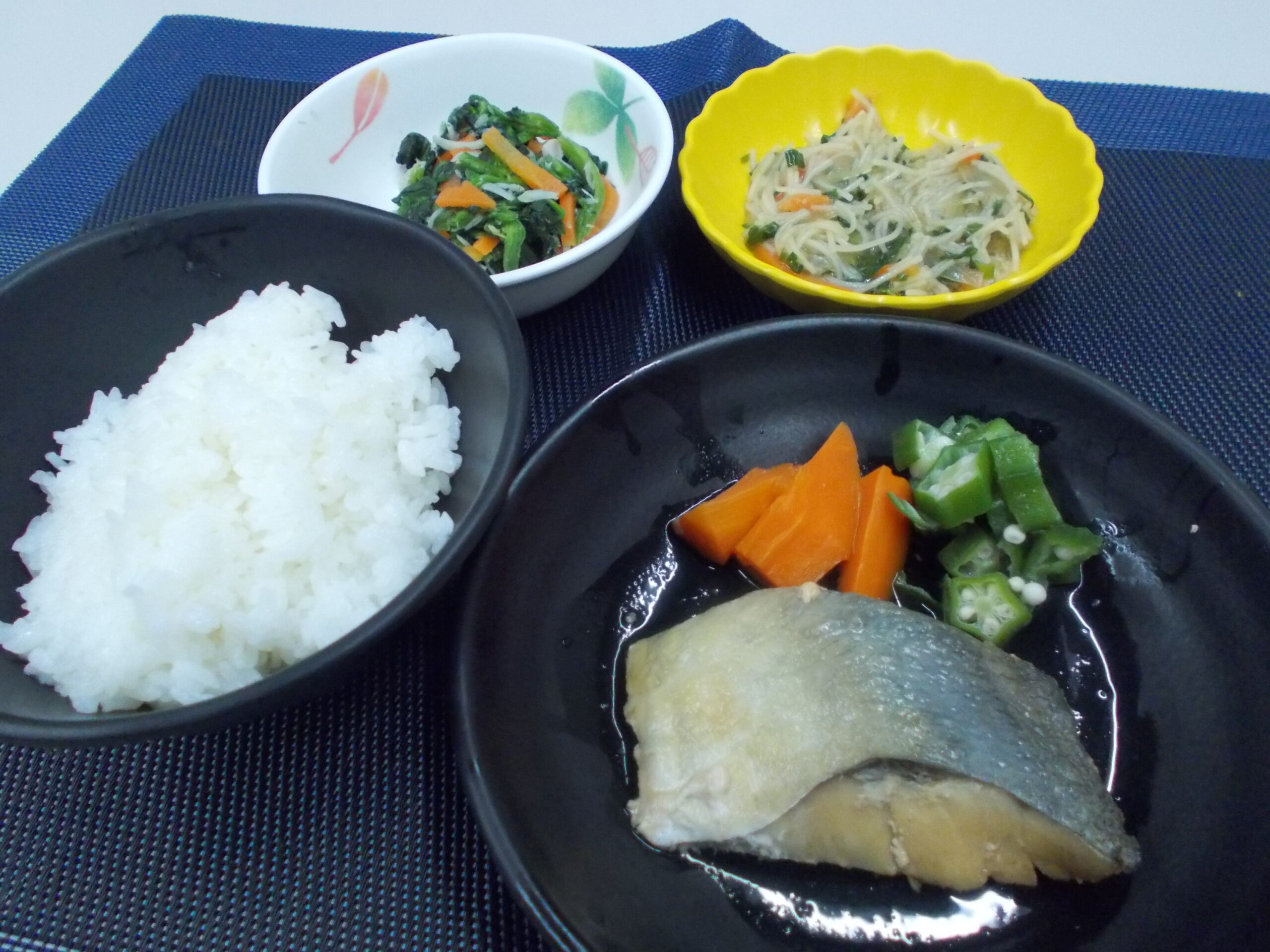 夕食 ご飯 アジの酢醤油煮 ビーフン炒め ほうれん草のしらす和え