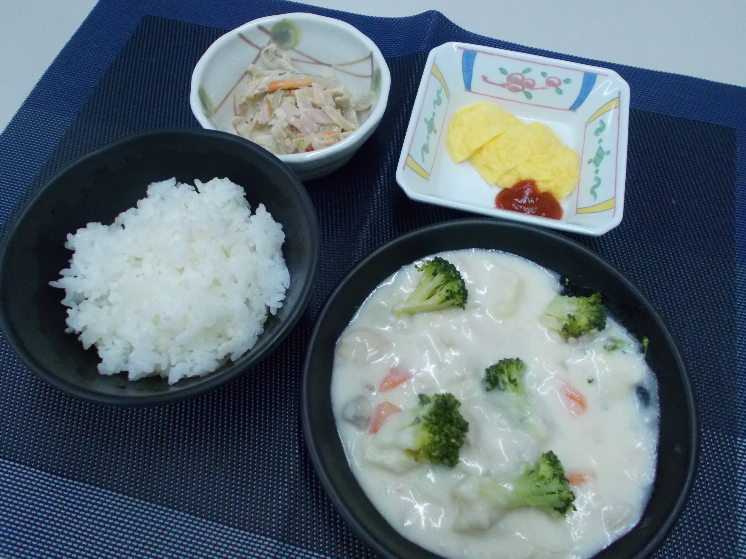 夕食 ご飯 クリームシチュー ミニオムレツ ごぼうサラダ