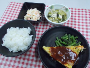 夕食 ご飯 スパニッシュオムレツ ブロッコリーのあんかけ マカロニサラダ