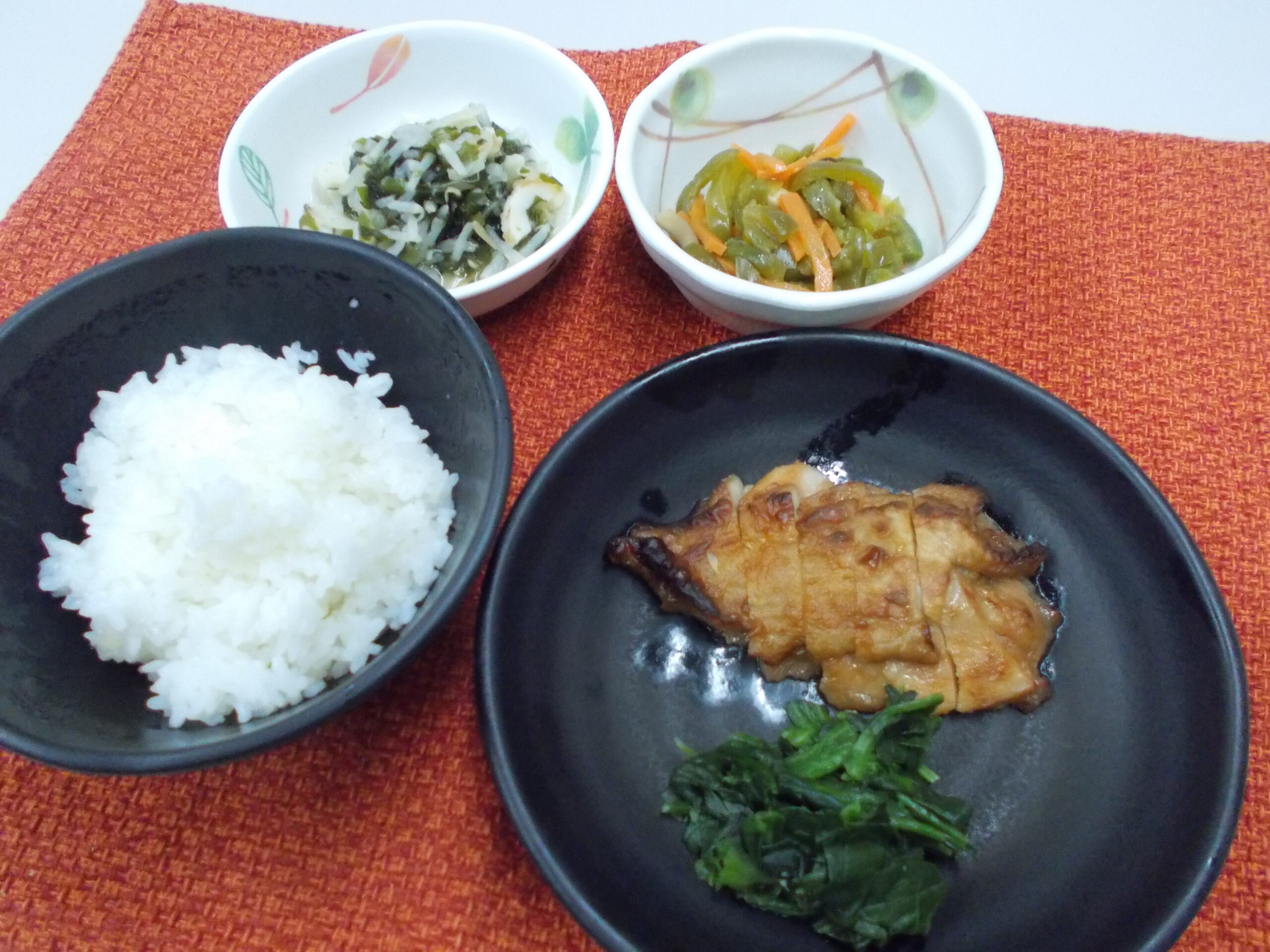 夕食 ご飯 バーベキューチキン 三色きんぴら わかめともやしの酢の物