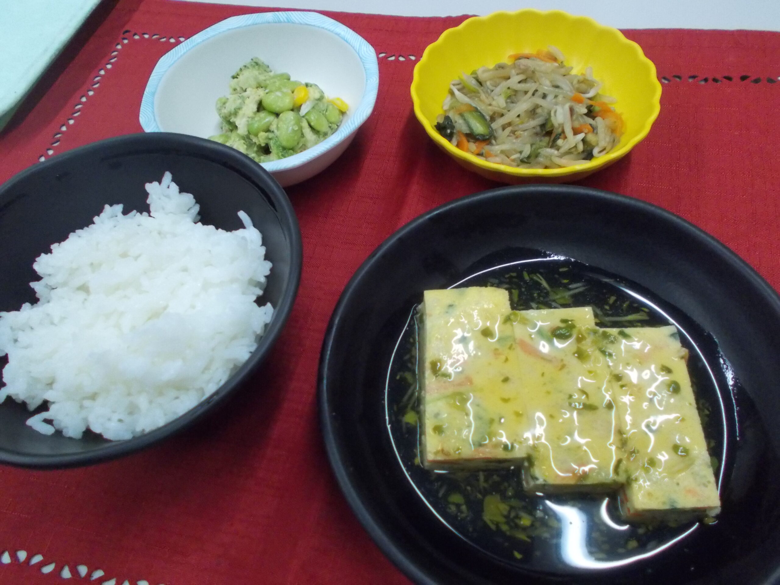 夕食 ご飯 千草焼き もやしのガーリックソテー 枝豆とコーンのサラダ