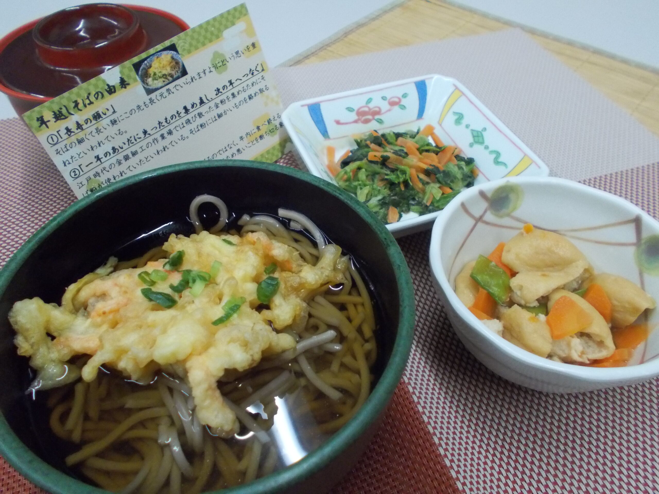 夕食 年越しそば がんもの煮物 ほうれん草のクルミ和え
