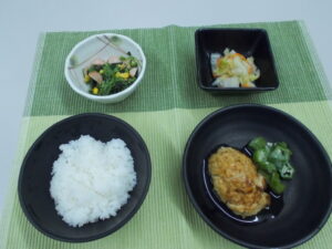 夕食 ご飯 手作り鶏つくね ほうれん草の炒め物 白菜の浅漬け