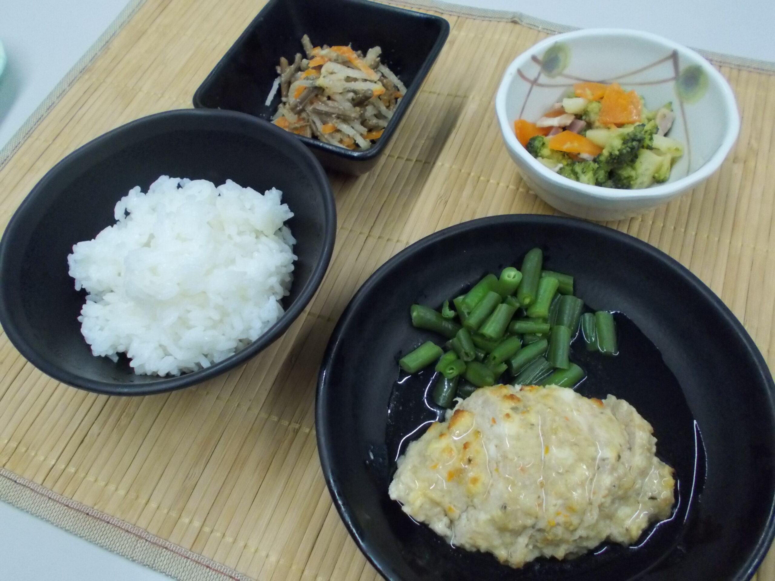 夕食 ご飯 手作り鶏つくね ブロッコリーの炒め物 もやしのナムル