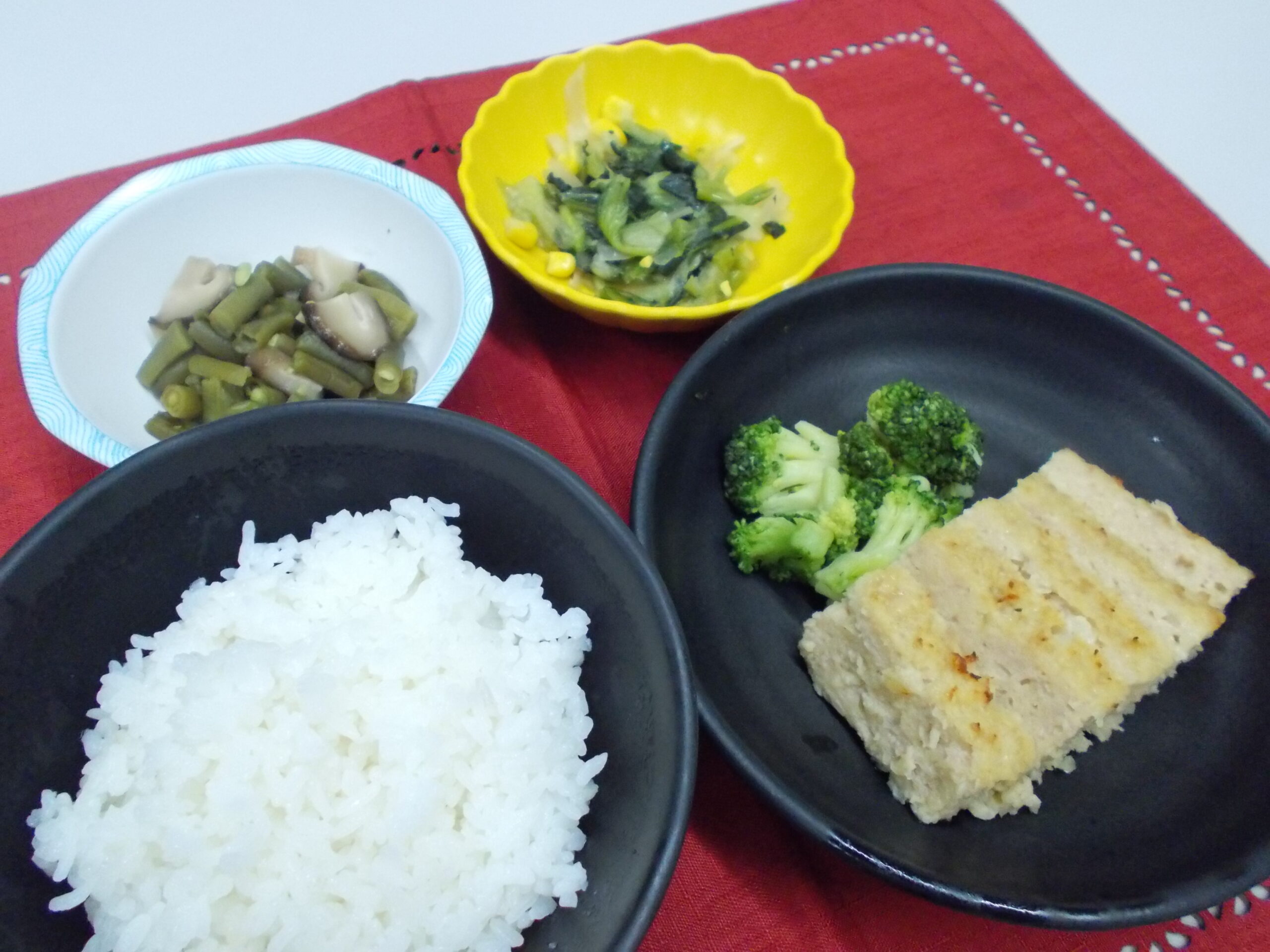 夕食 ご飯 松風焼き チンゲン菜のソテー いんげんの青じそ和え