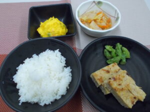 夕食 ご飯 松風焼き 白菜の煮浸し かぼちゃサラダ