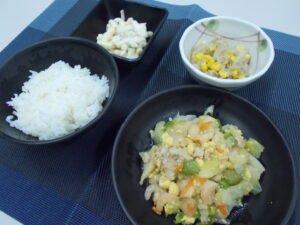 夕食 ご飯 海老と卵の炒め物 もやしとコーンのソテー マカロニサラダ