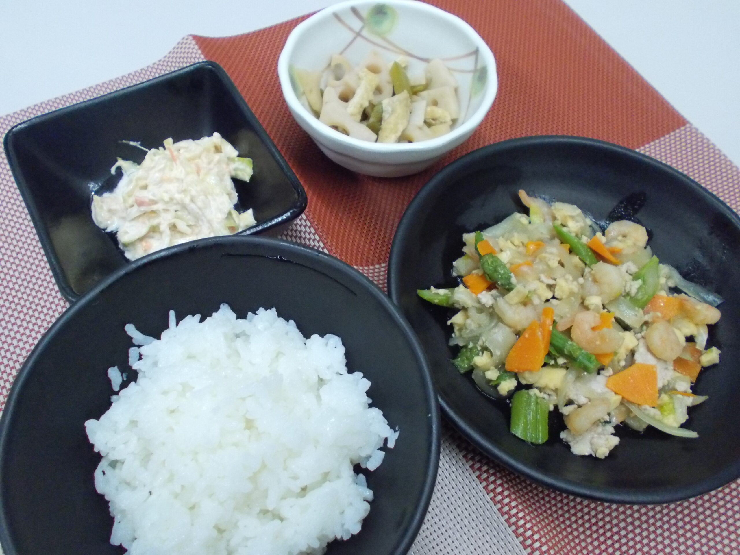 夕食 ご飯 海老と卵の炒め物 蓮根の甘辛煮 ツナサラダ