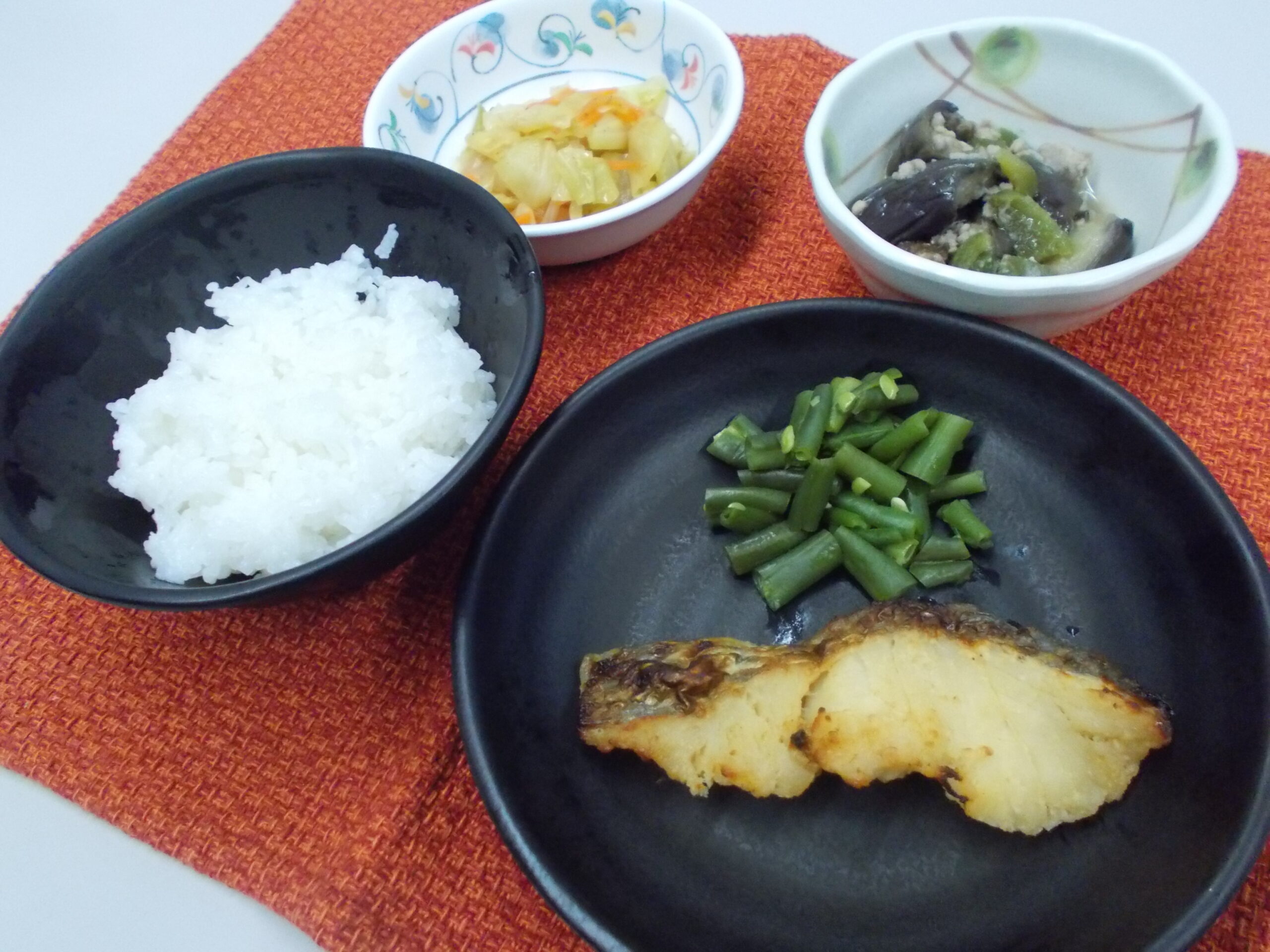 夕食 ご飯 白身魚のごま味噌焼き 茄子の挽肉炒め キャベツの和え物