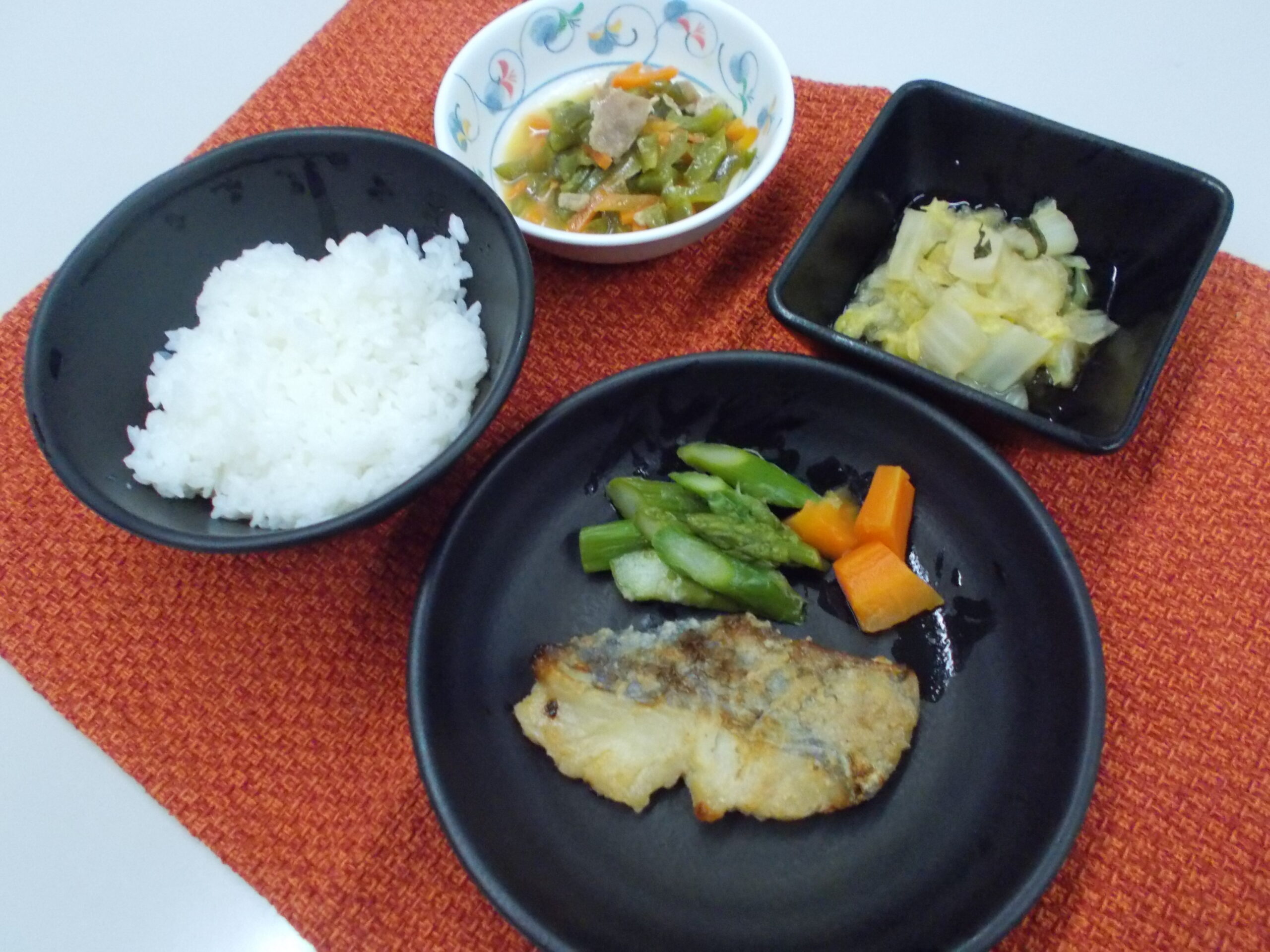 夕食 ご飯 白身魚のごま味噌焼き ピーマンの金平風 白菜の青じそ和え