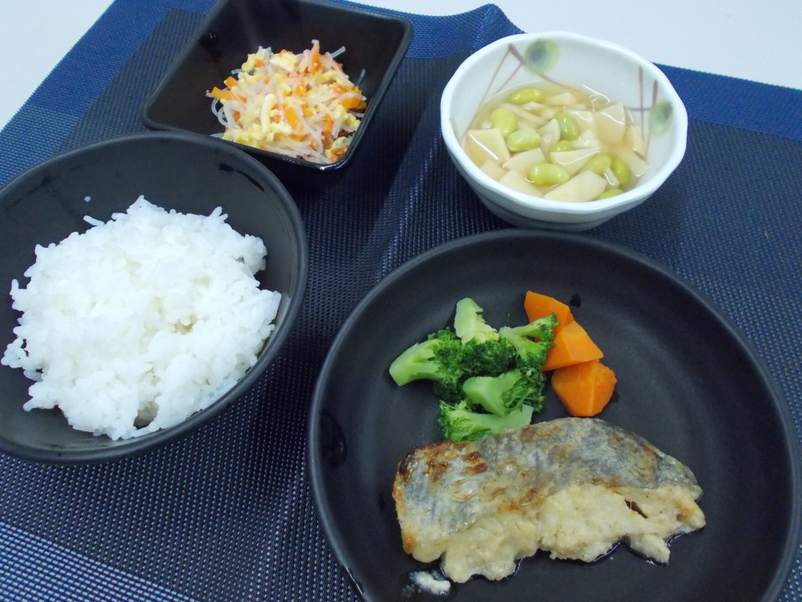 夕食 ご飯 白身魚のごま味噌焼き 筍と枝豆の薄くず煮 春雨の和え物