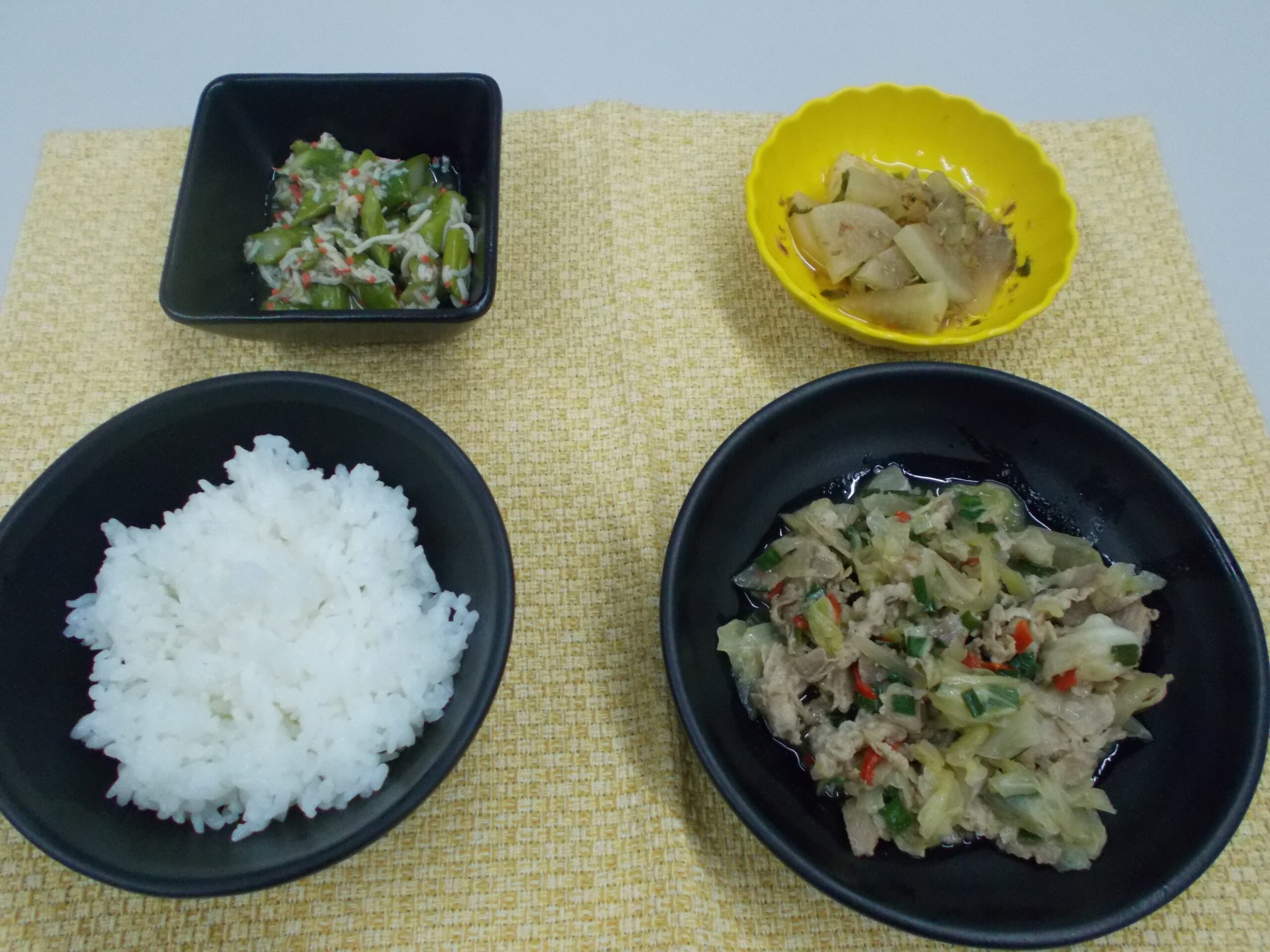 夕食 ご飯 肉野菜炒め 大根の土佐煮 アスパラとかにの和え物