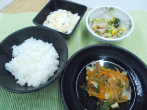 夕食 ご飯 蒸し鱈のポン酢かけ ソーセージと野菜の炒め物 春雨サラダ