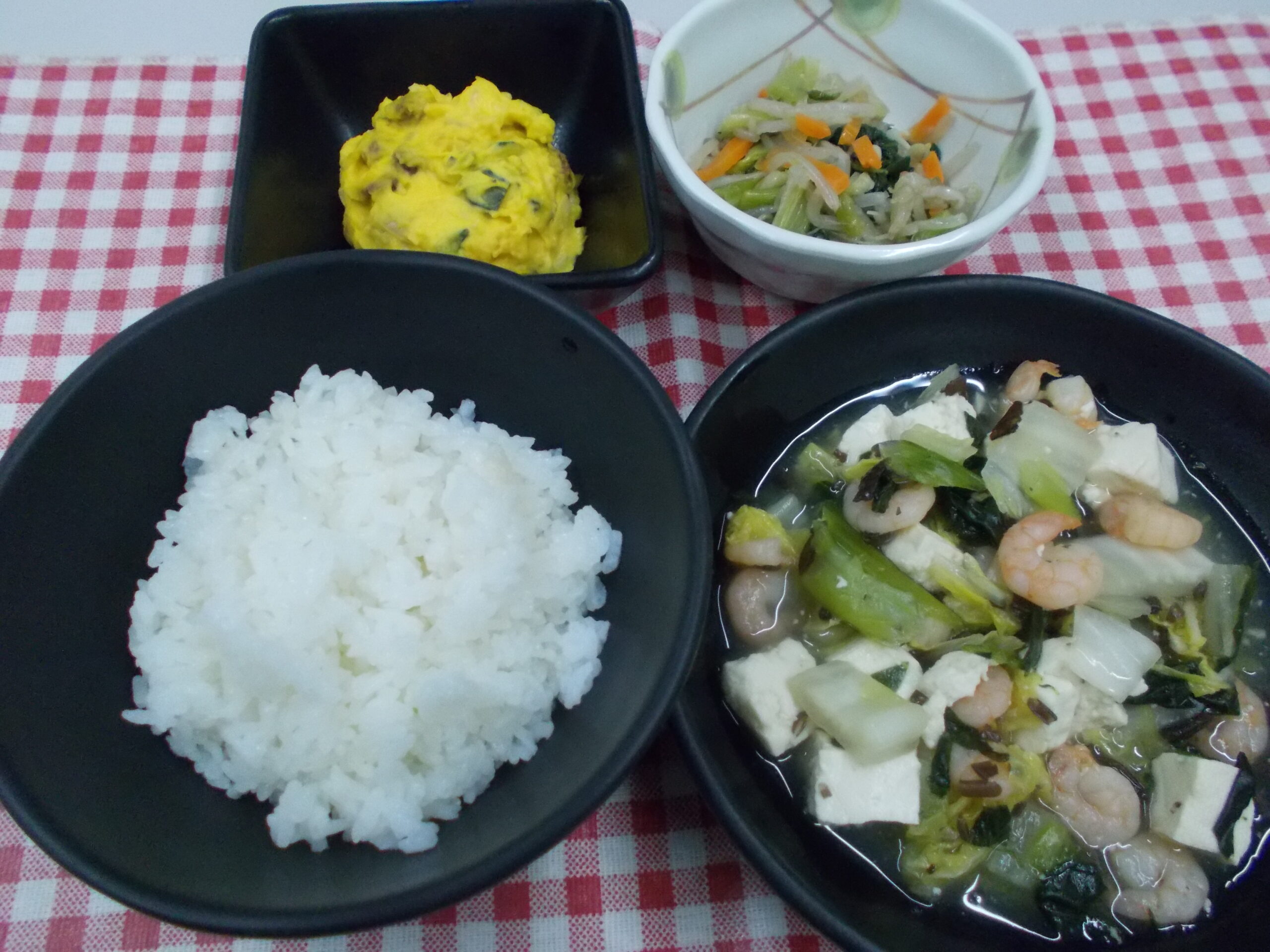 夕食 ご飯 豆腐と海老の中華煮 もやし炒め かぼちゃサラダ