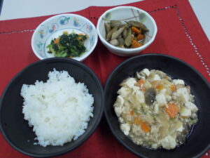 夕食 ご飯 豆腐のきのこそぼろ煮 ごぼうの甘辛煮 チンゲン菜の和え物
