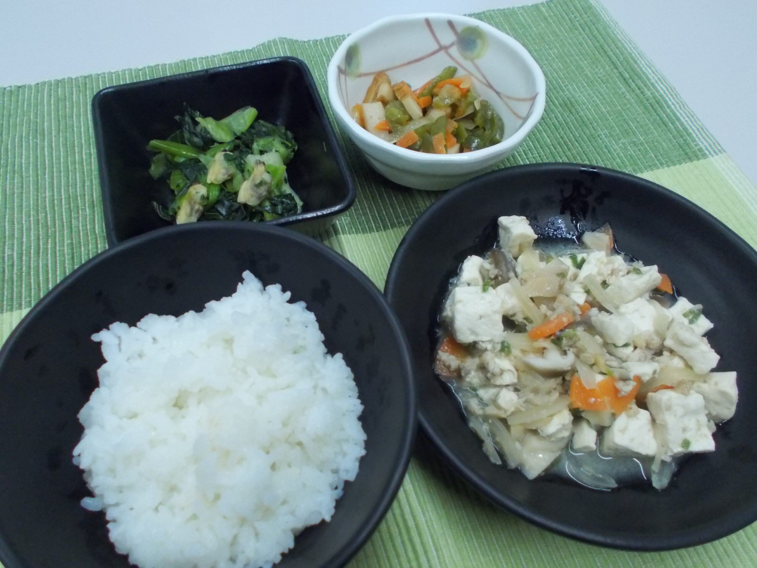 夕食 ご飯 豆腐のきのこそぼろ煮 ピーマンの炒め物 チンゲン菜と浅利の和え物