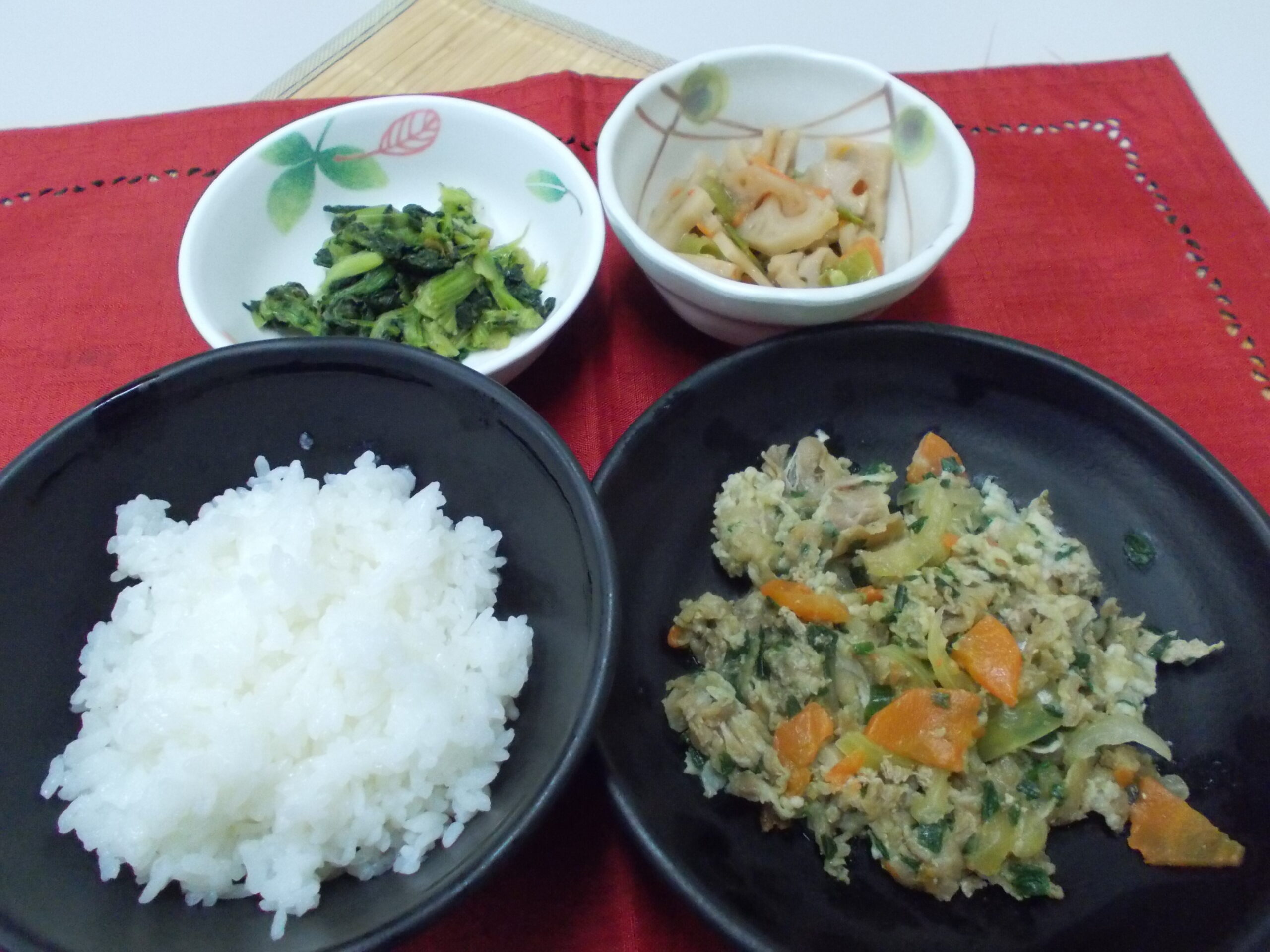 夕食 ご飯 豚ニラ炒め 蓮根のピリ辛炒め かつお和え
