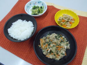 夕食 ご飯 豚ニラ炒め 蓮根の炒め煮 二色和え