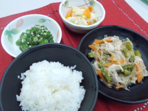 2025年10月20日 / 最終更新日 : 2025年10月23日 yorokobien 夕食 夕食 豚肉とアスパラの炒め物 夕食 ご飯 豚肉とアスパラの炒め物 カリフラワーのコンソメ煮 オクラの和え物