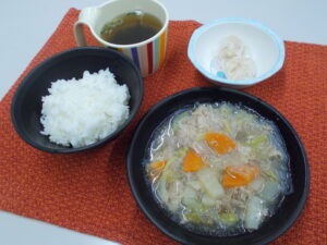 夕食 ご飯 豚肉と春雨の旨煮 焼売 中華スープ