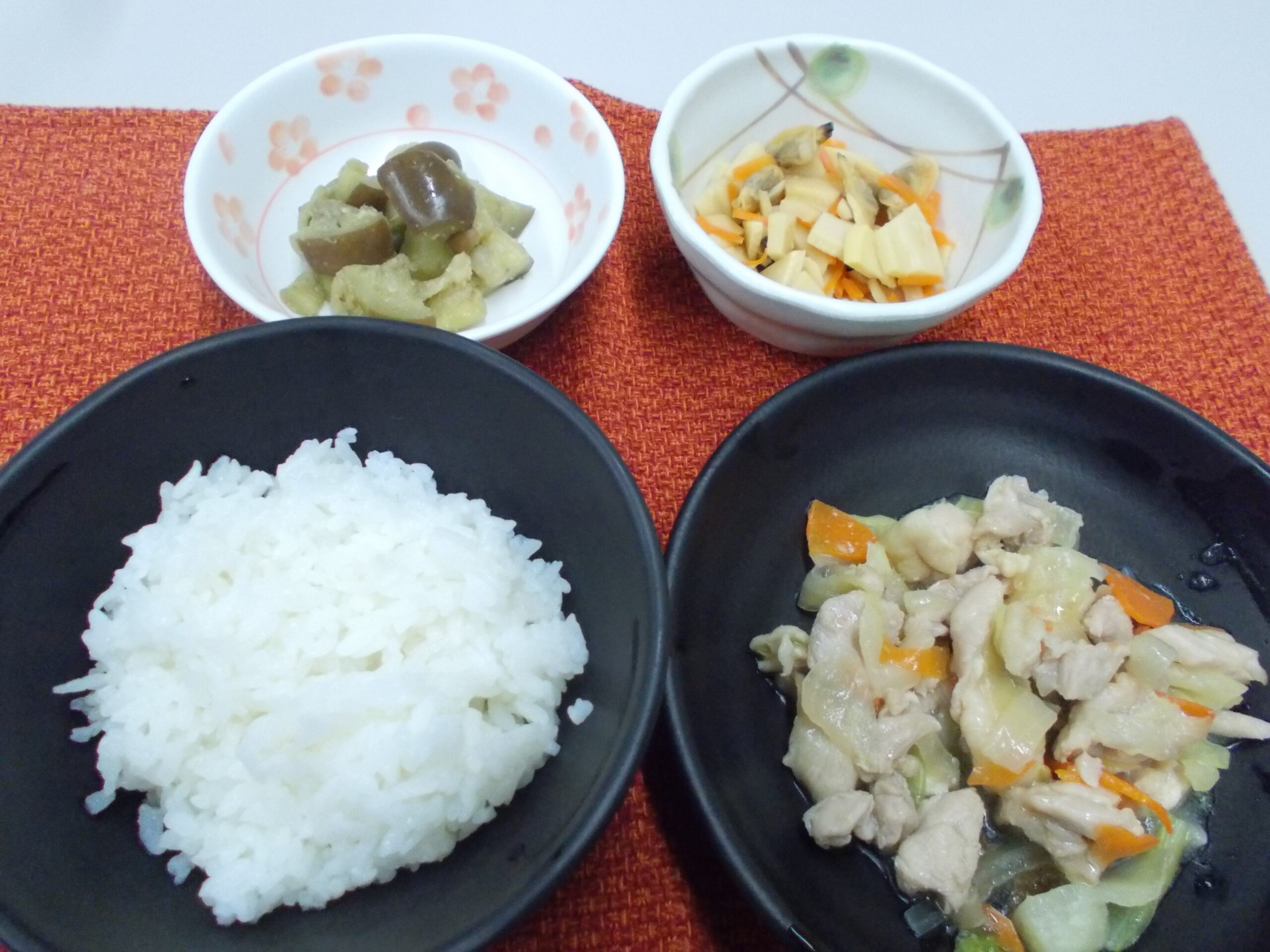 夕食 ご飯 豚肉と野菜の酒蒸し 茄子の生姜和え