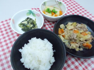 夕食 豚肉と野菜の炒め物 じゃが芋の煮物 小松菜とささみの青じそ和え