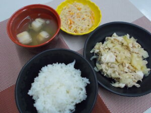 夕食 ご飯 豚肉の生姜炒め 春雨の和え物 みそ汁(麩・ねぎ)