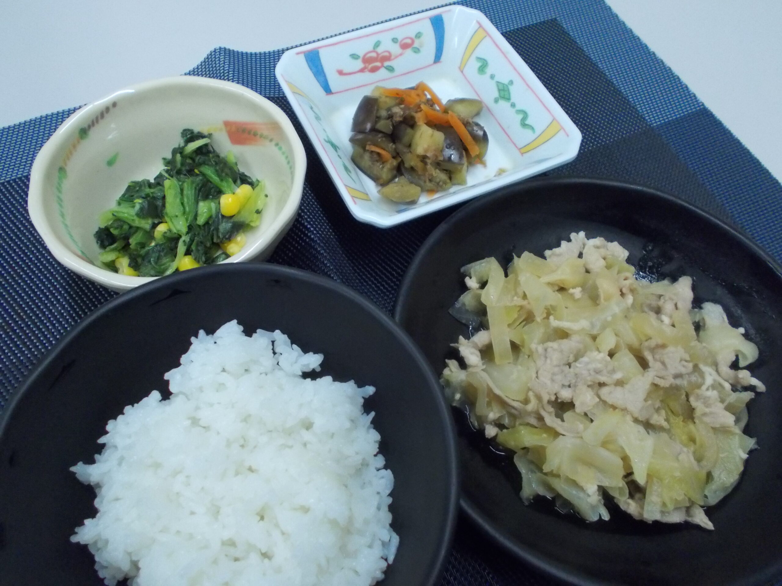 夕食 ご飯 豚肉の生姜炒め 小松菜のソテー 茄子のおかか和え