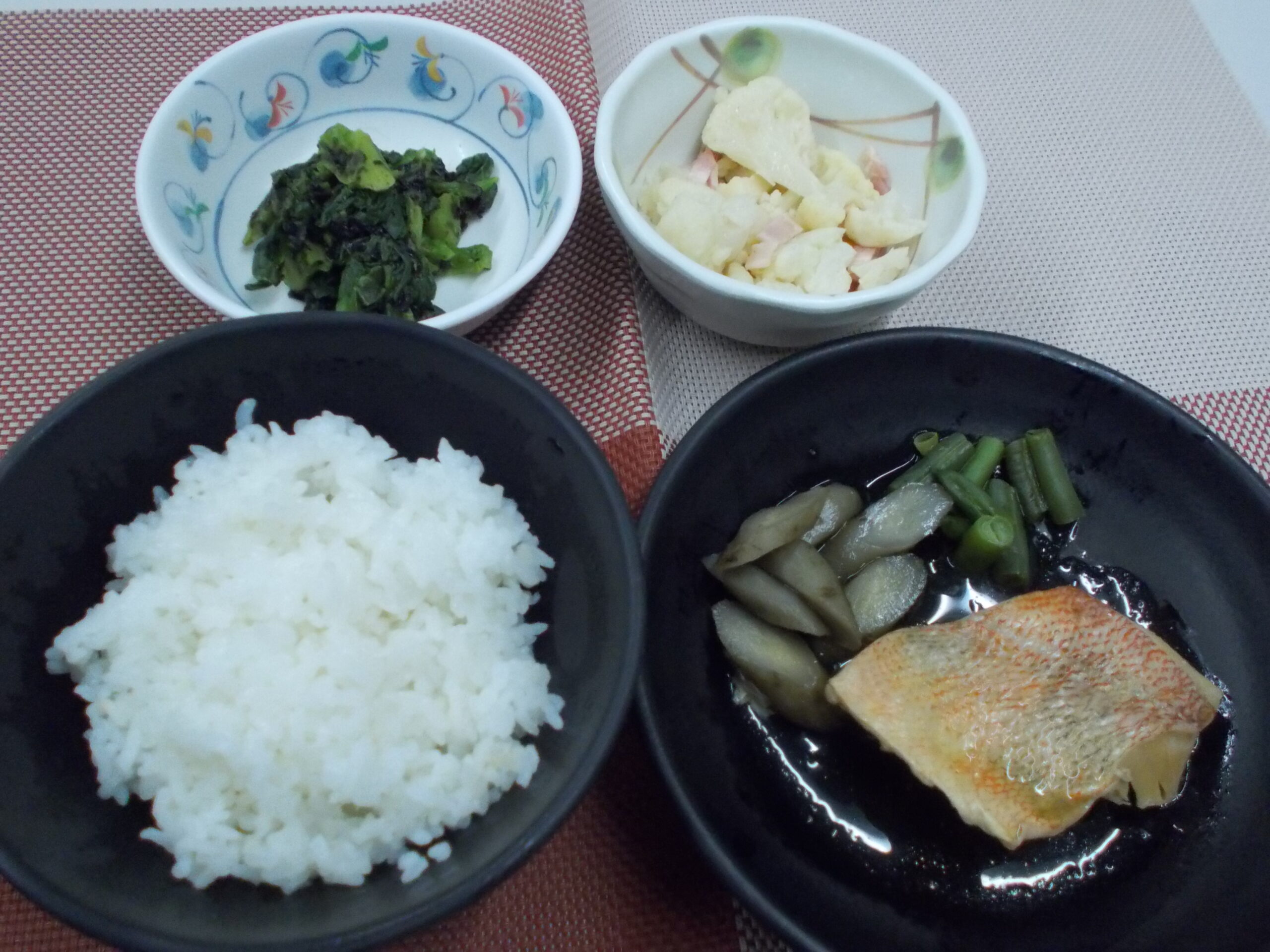 夕食 ご飯 赤魚の煮付け カリフラワーの炒め物 菜の花の和え物