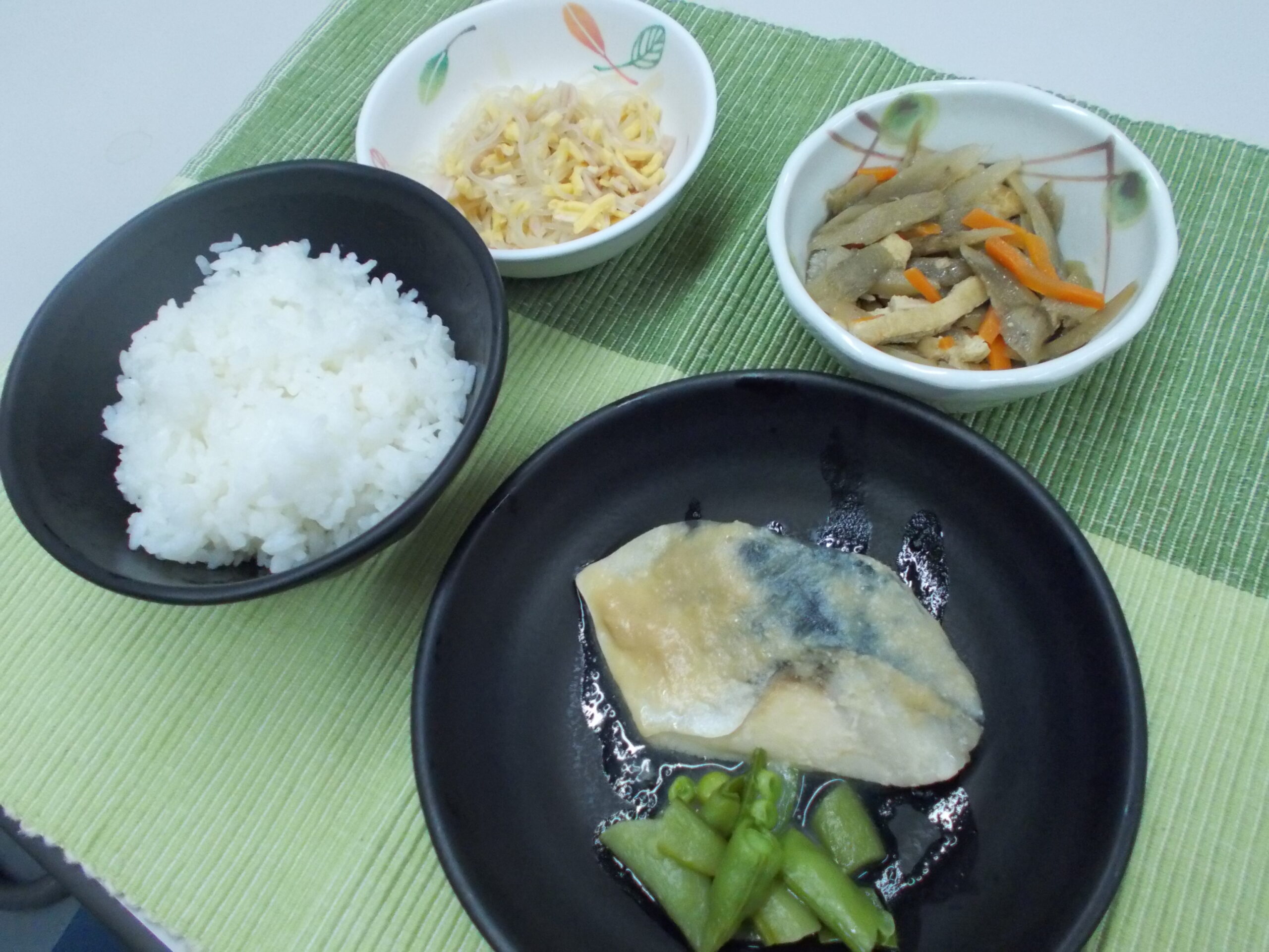 夕食 ご飯 鯖の味噌煮 きんぴら 春雨の和え物