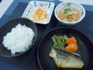 夕食 ご飯 鯖の和風ムニエル 大根の煮物 キャベツの和え物