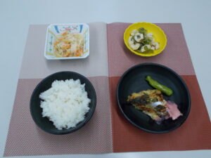 夕食 ご飯 鯖の香味焼き ちくわとピーマンの炒め物 キャベツの和え物