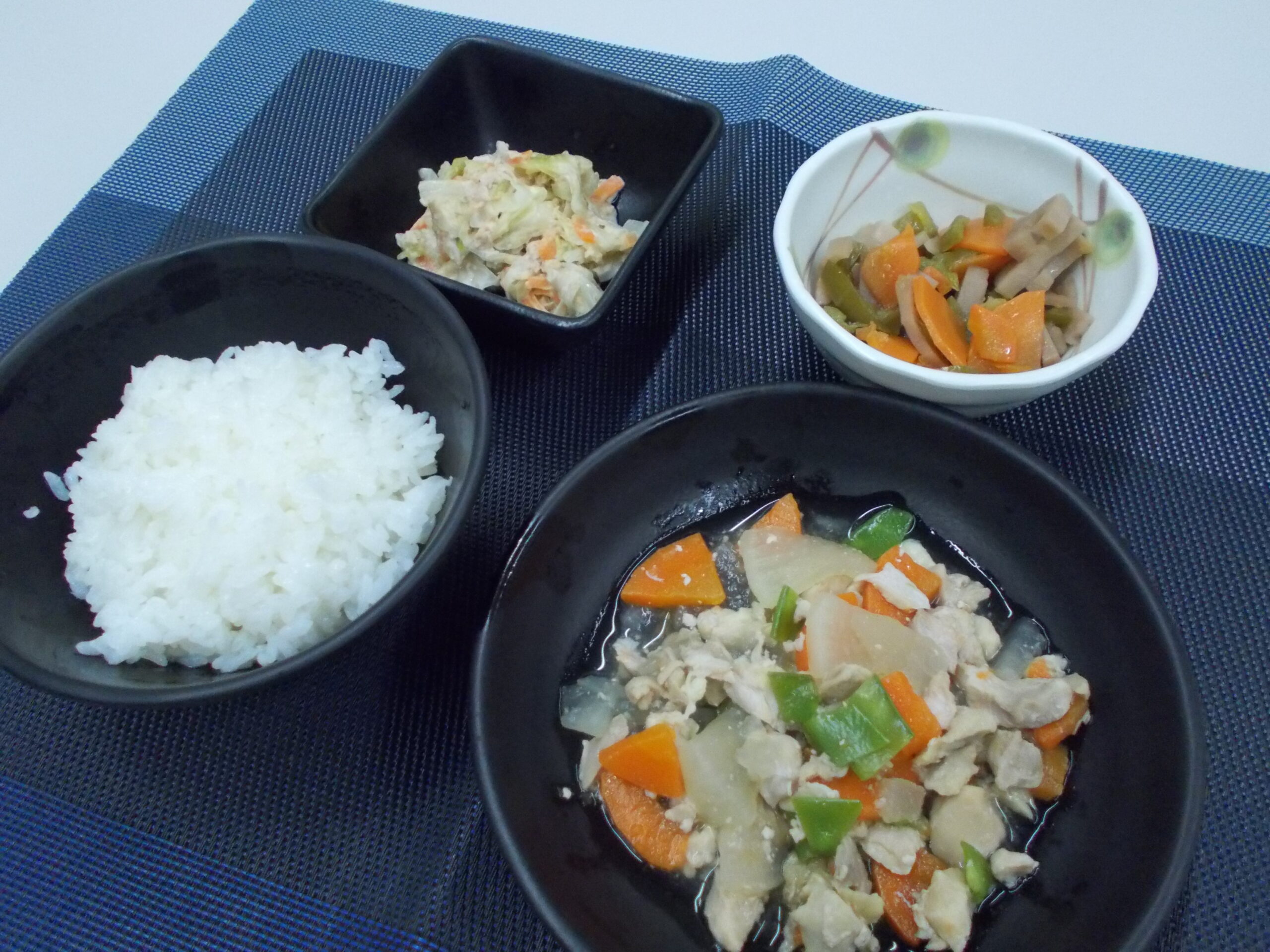 夕食 ご飯 鶏のさっぱり煮 蓮根の炒め物 ツナサラダ