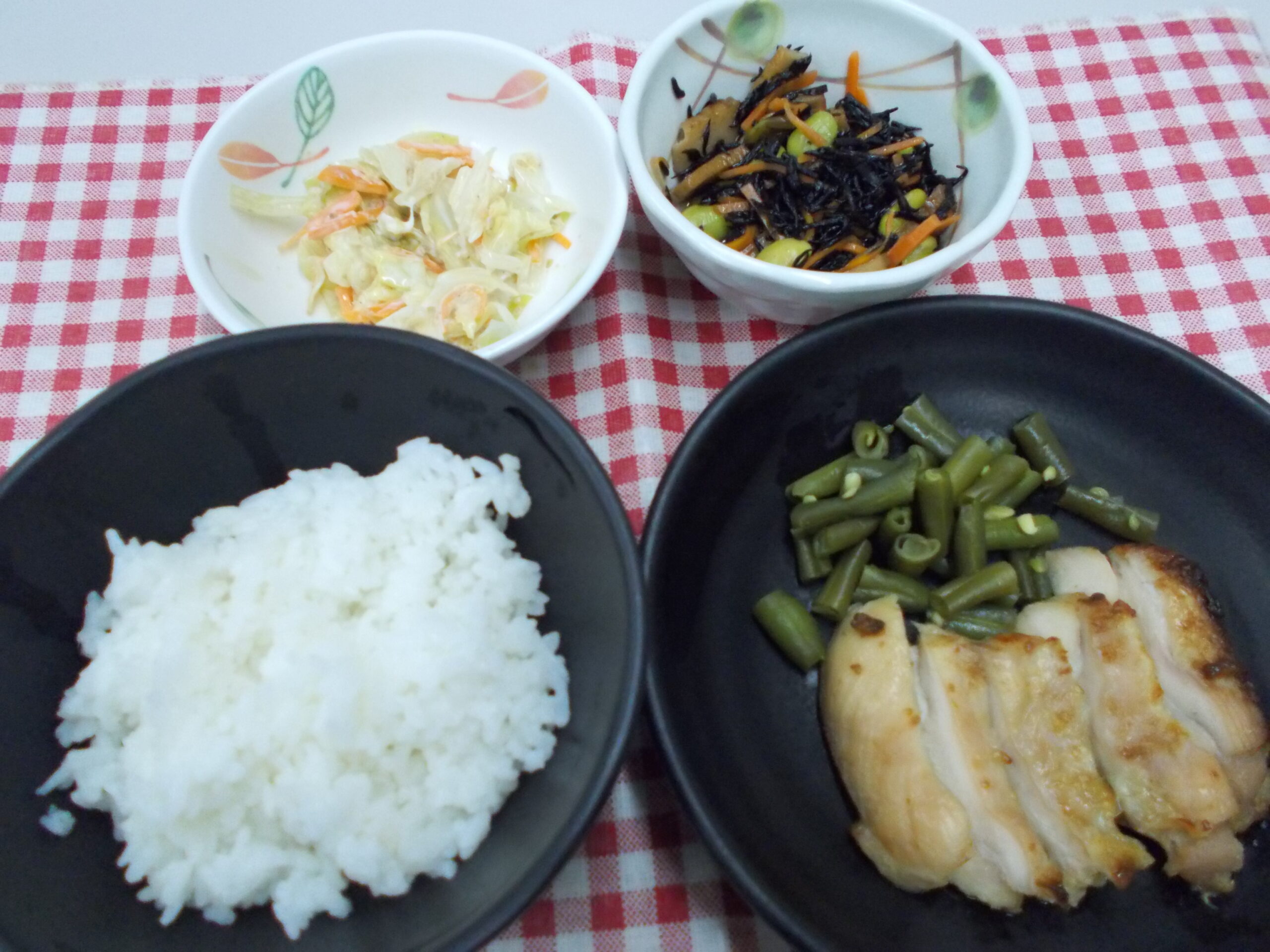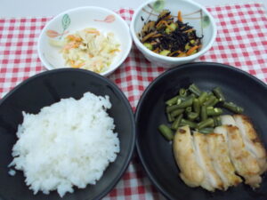 夕食 ご飯 鶏の柚子胡椒焼き ひじき煮 キャベツサラダ