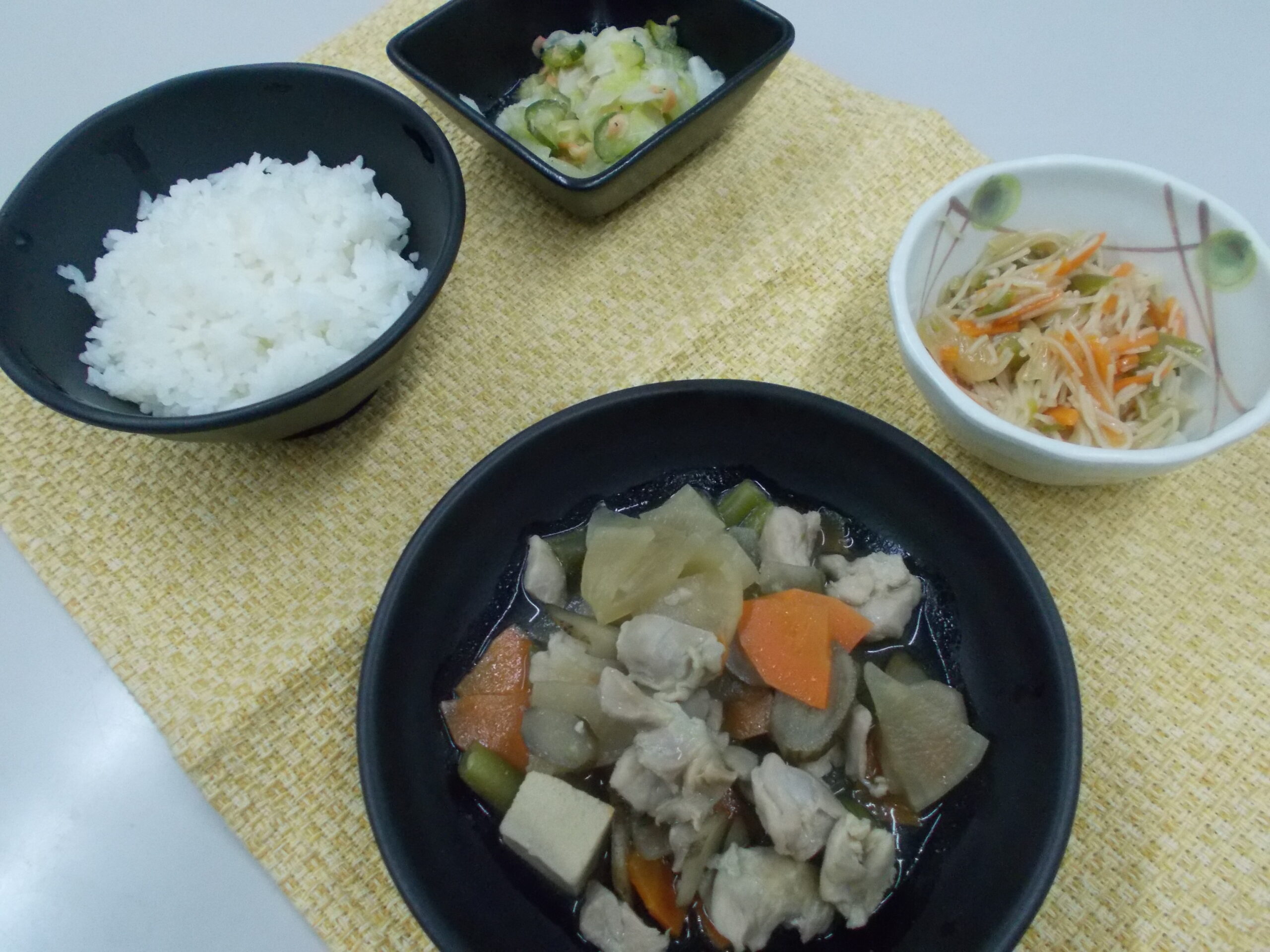 夕食 ご飯 鶏肉の根菜煮 ビーフン炒め 桜海老とキャベツのごま酢和え