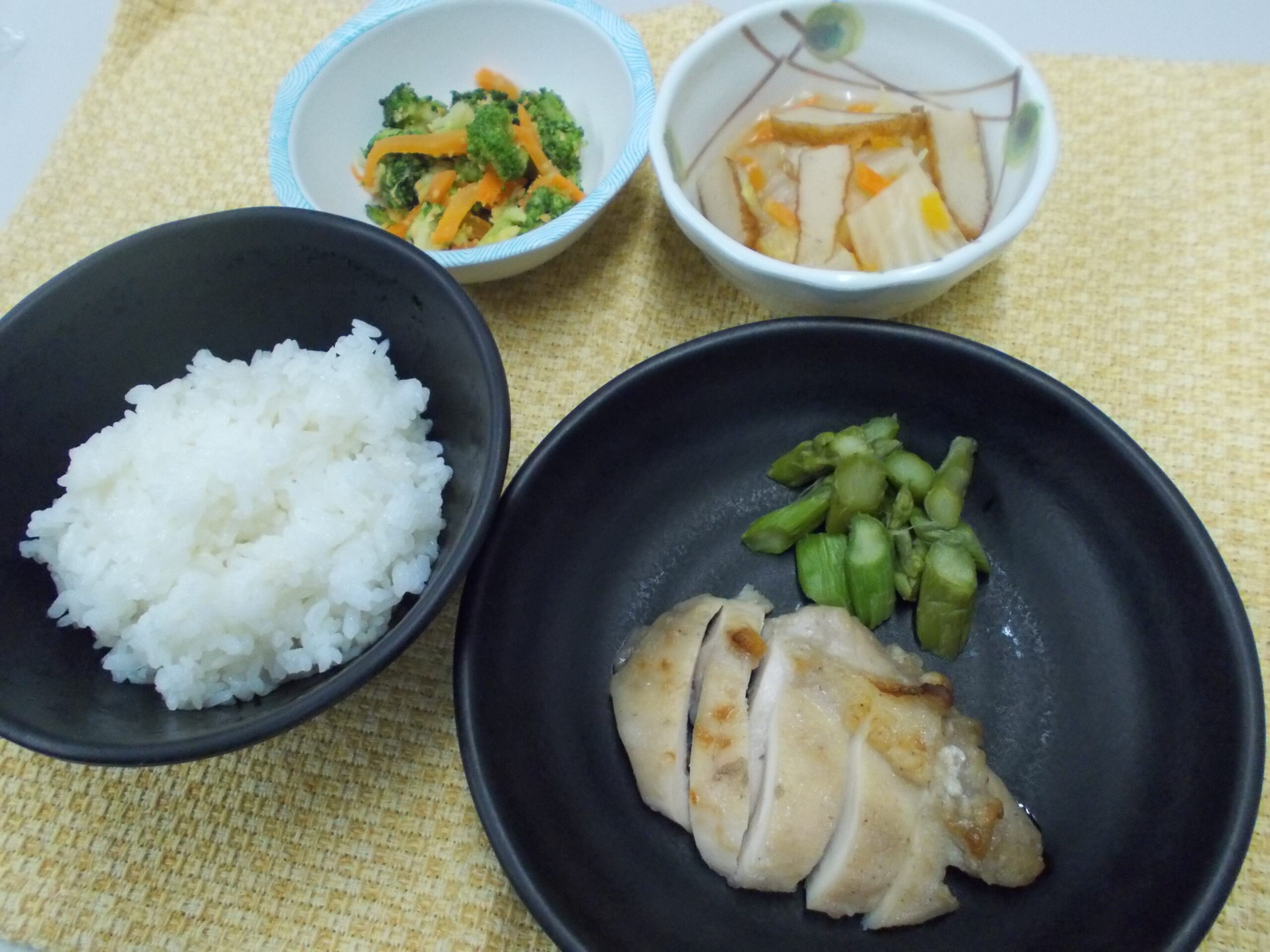 夕食 ご飯 鶏肉の梅風味焼き 白菜の煮浸し ブロッコリーのピーナッツ和え