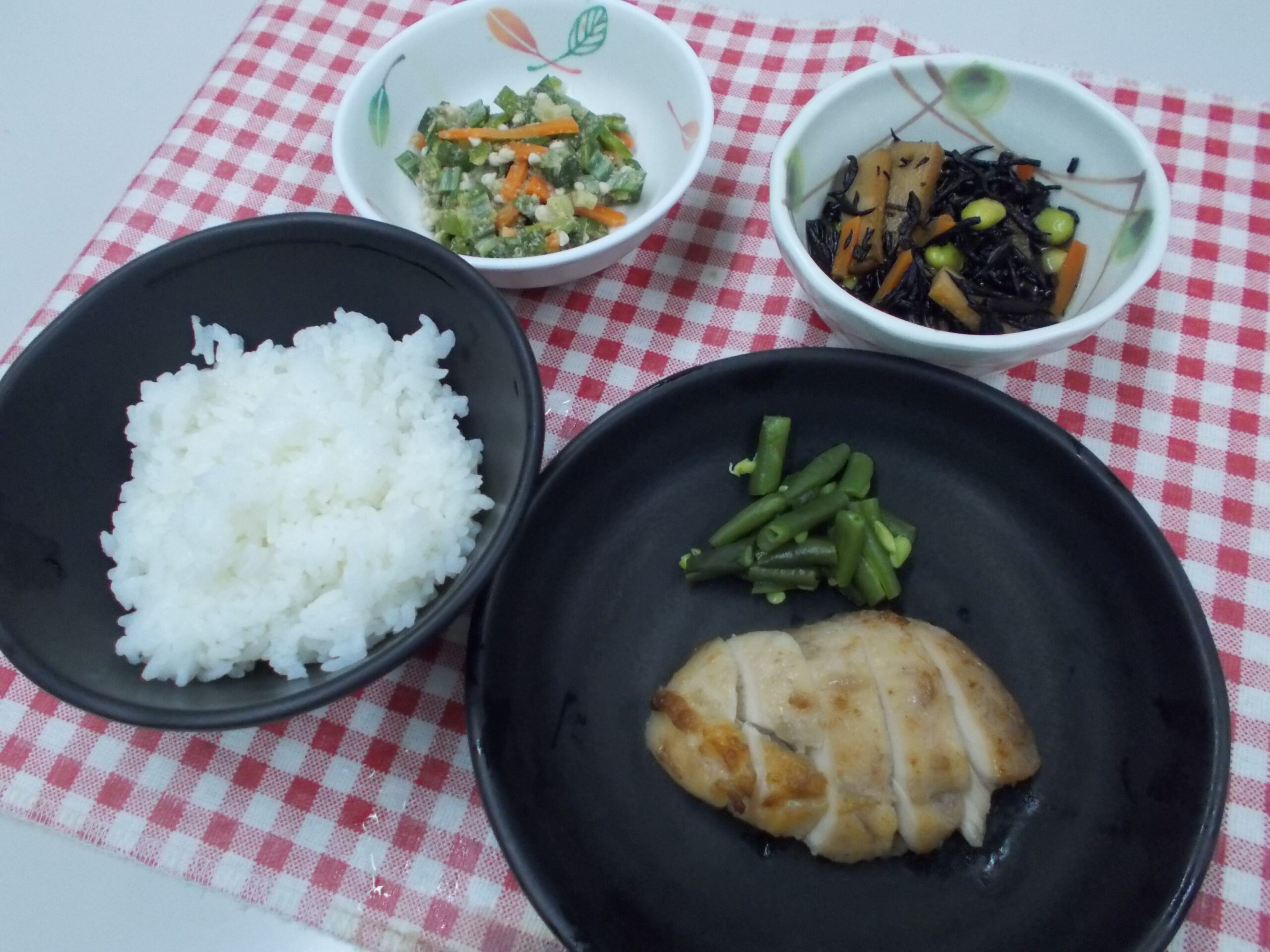 夕食 ご飯 鶏肉の梅風味焼き ひじき煮 オクラのごま和え