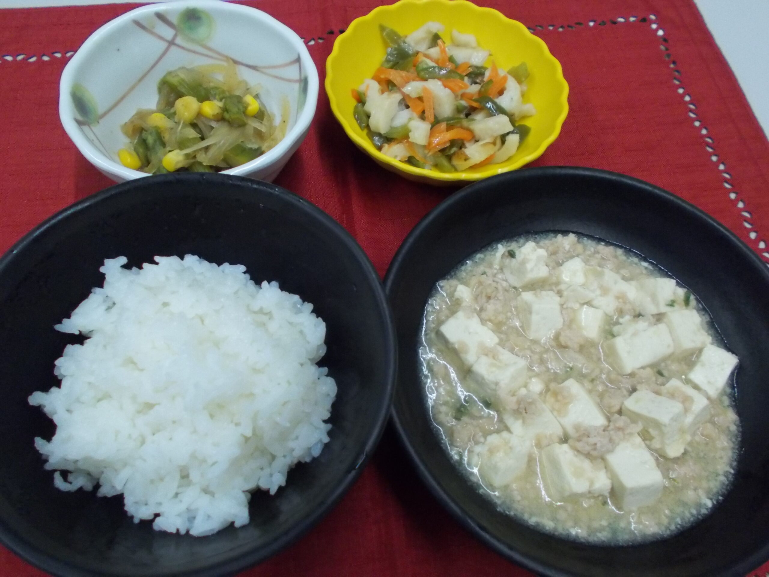夕食 ご飯 麻婆豆腐 ちくわとピーマンの炒め物 アスパラサラダ