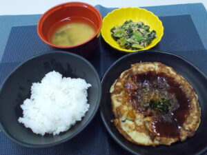 昼食 ご飯 お好み焼き チンゲン菜のツナ和え みそ汁(しめじ・ねぎ)