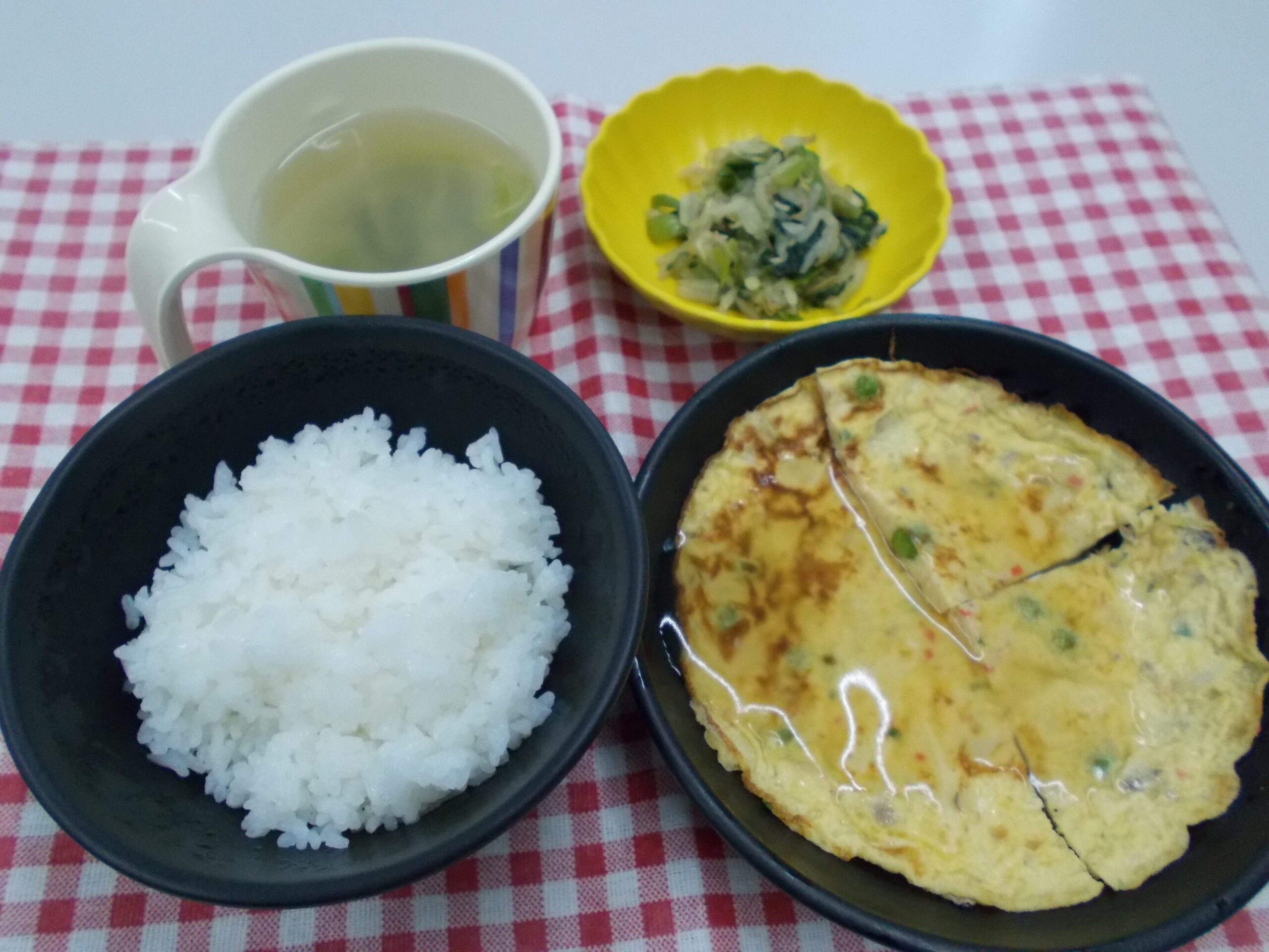 夕食 ご飯 かに玉 もやしの和え物 中華スープ