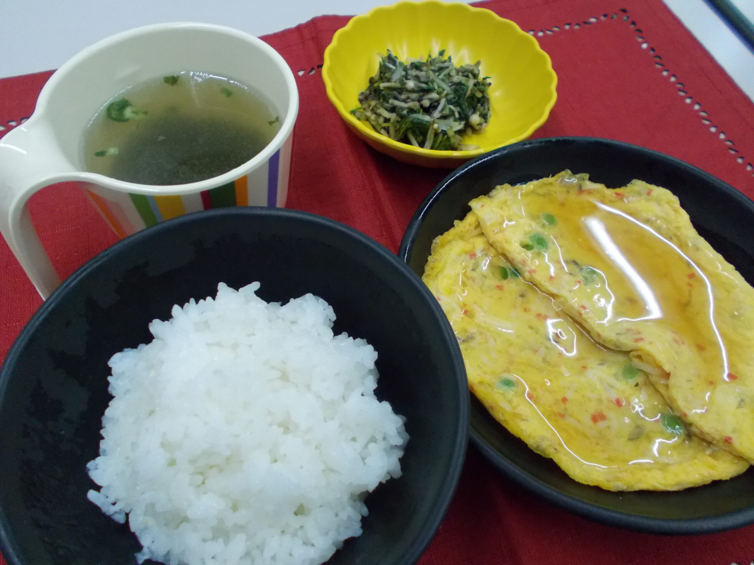 昼食 ご飯 かに玉 水菜の和え物 中華スープ