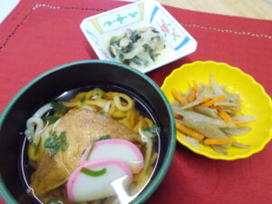 昼食 きつねうどん 金平ごぼう あさりの酢味噌和え