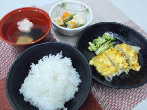 昼食 ご飯 さわらのミモザ焼き 高野豆腐の含め煮 清汁(花麩・わかめ)