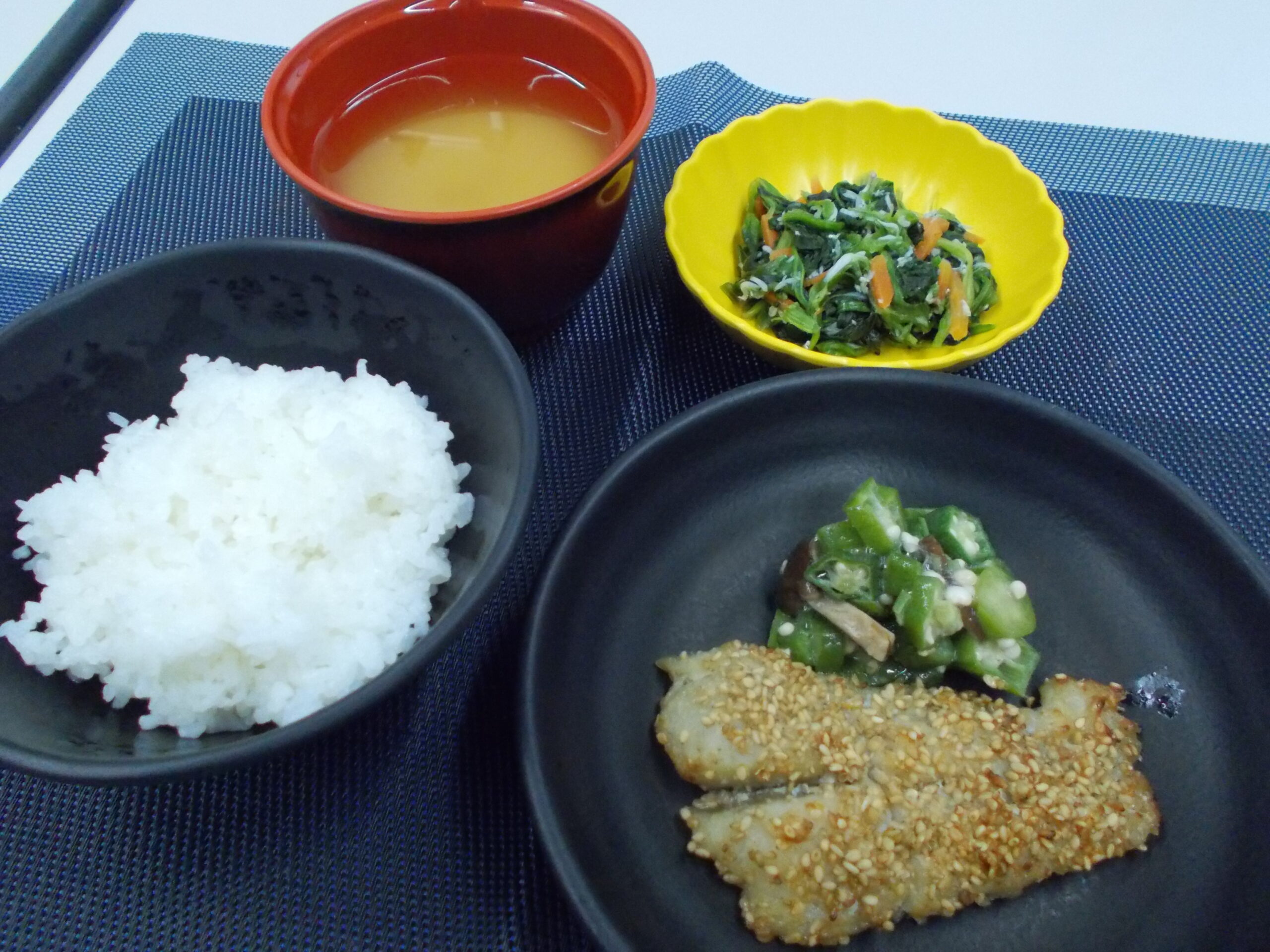 昼食 ご飯 さわらの利休焼き ほうれん草のしらす和え みそ汁(南瓜・きぬさや)
