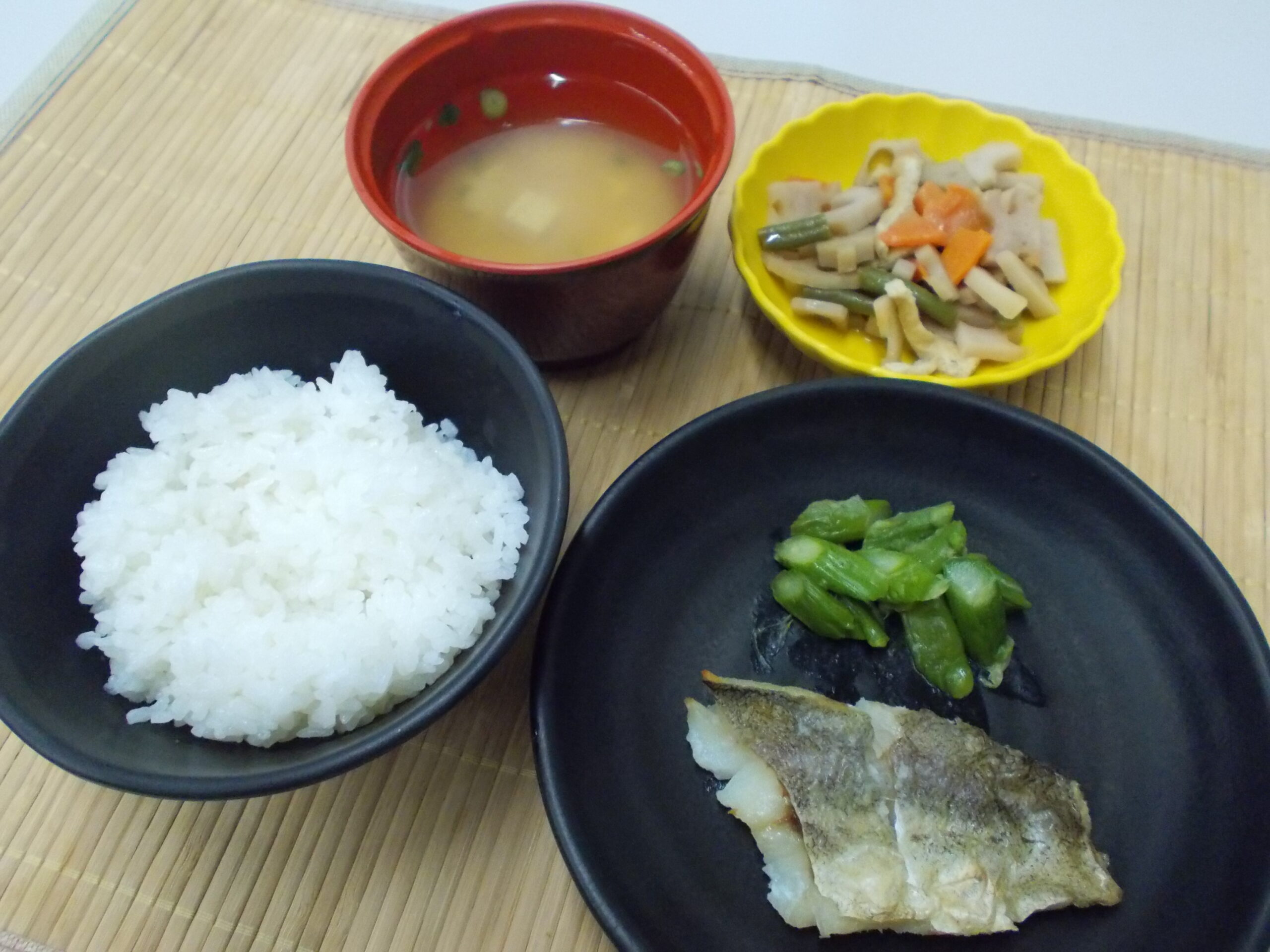 昼食 ご飯 たらのムニエル 蓮根の炒め物 みそ汁(豆腐・ねぎ)