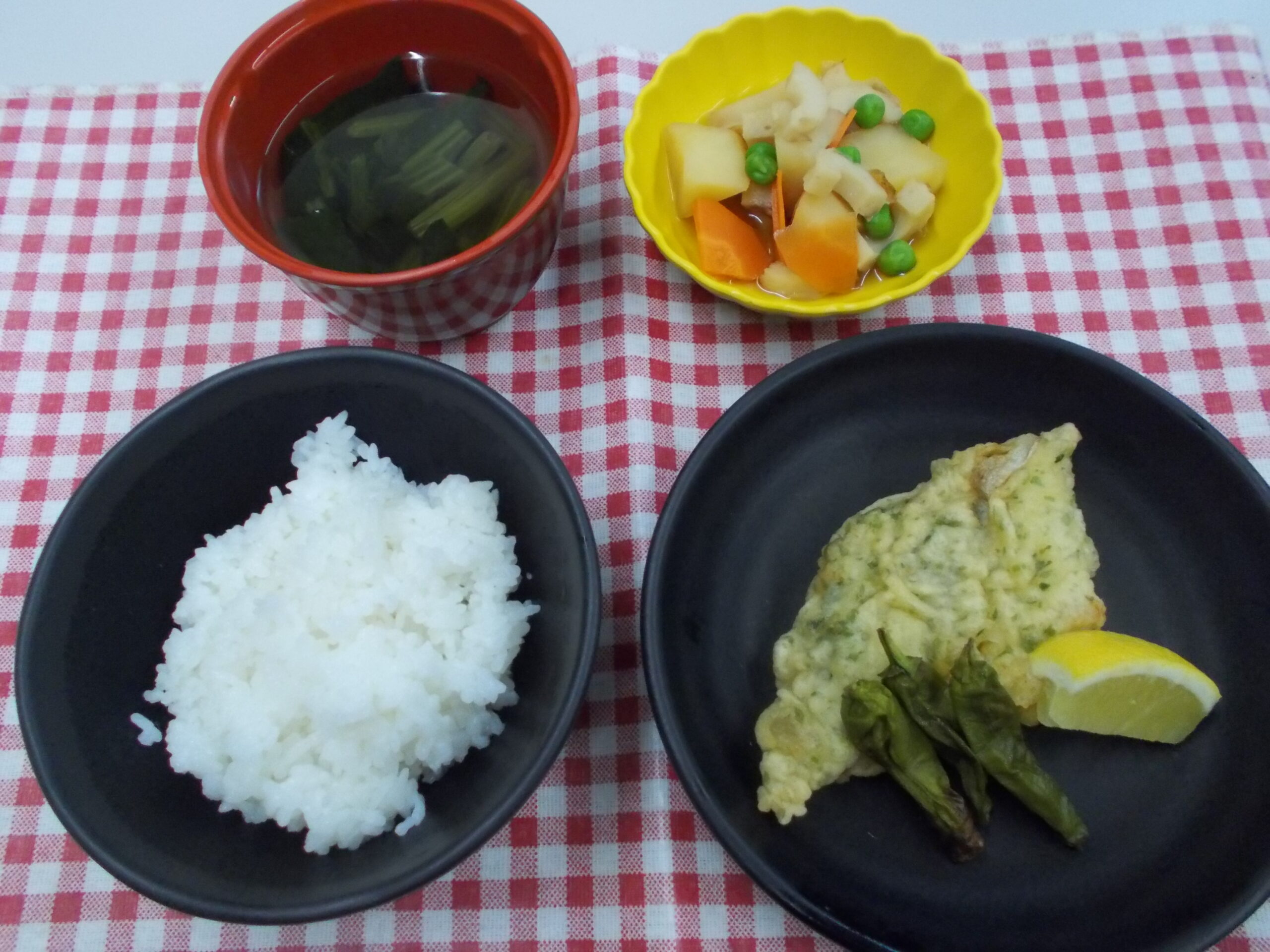 昼食 ご飯 たらの磯辺揚げ じゃが芋の煮物 清汁(ほうれん草・椎茸)