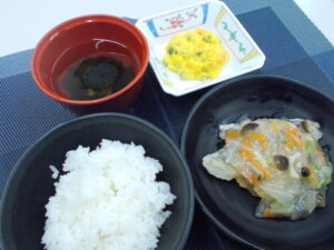 昼食 ご飯 たらの野菜あんかけ かぼちゃサラダ 清汁(わかめ・ねぎ)