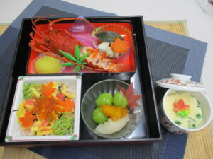 2025年9月18日 / 最終更新日 : 2025年9月19日 yorokobien 昼食 昼食 ちらし寿司 伊勢海老 〈長寿を祝う会〉 昼食 ちらし寿司 伊勢海老 炊き合わせ 栗きんとん 茶碗蒸し フルーツ盛り合わせ(シャインマスカット 柿 梨) 〈長寿を祝う会〉